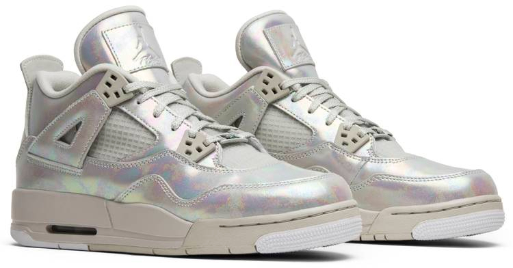 Unveiled as exclusive . the ‘Pearl’ edition of the Jordan 4 features an iridescent finish throughout the upper’s patent leather construction. A tonal grey midsole is contrasted with subtle white hues on the ends of the outsole . which sports green underfoot. The visible Air unit in the heel provides cushioning.