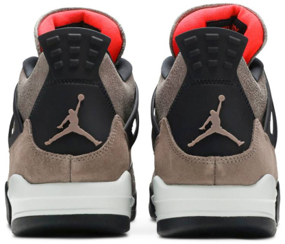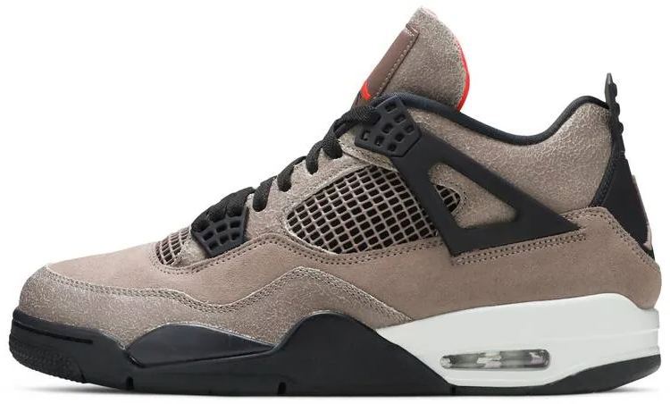The Air Jordan 4 Retro ‘Taupe Haze’ presents an understated colorway of Tinker Hatfield’s 1989 design. A dark taupe finish is applied to the upper . constructed from a blend of textured suede with cracked leather on the collar . tongue and mudguard. Contrasting black hits land on the laces . plastic wings and heel tab . the latter marked with an embossed Jumpman logo. A second Jumpman icon is rendered in Infrared on the tongue tag . matching the interior lining of the tongue. Lightweight cushioning is provided by a two-tone PU midsole . housing a visible Air unit in the heel and encapsulated Air in the forefoot.