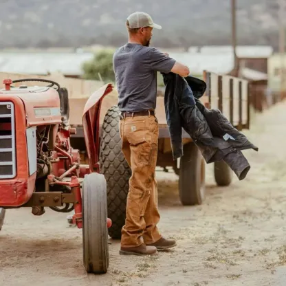 Hard work in, hard work out. Behind every pair of these pants are 61 pairs of hands that cut, sew, hem, and triple-stitch the 28 pieces that form the classic B01. So before they even show up on the jobsite, they've already lived through several shifts of hard work. These men's dungarees have changed very little since they were introduced in 1939. Rugged design featuring heavy-hauling back pockets and a double layer at the knees. Our heavyweight firm-hand duck is the most durable canvas out there.