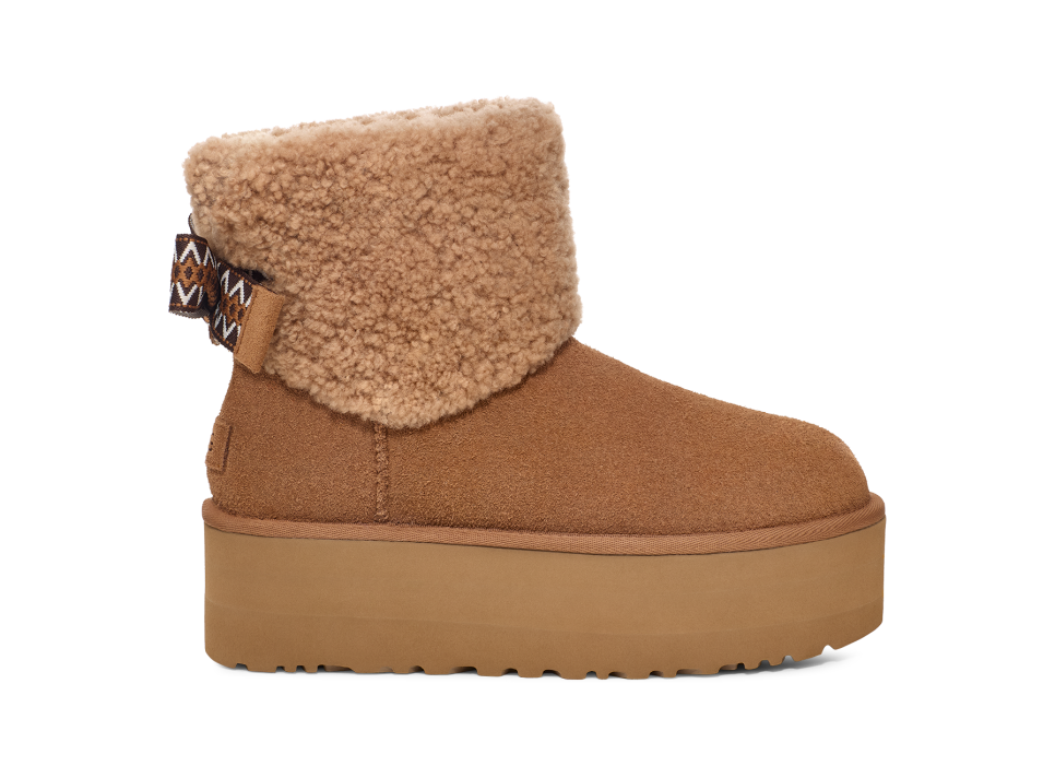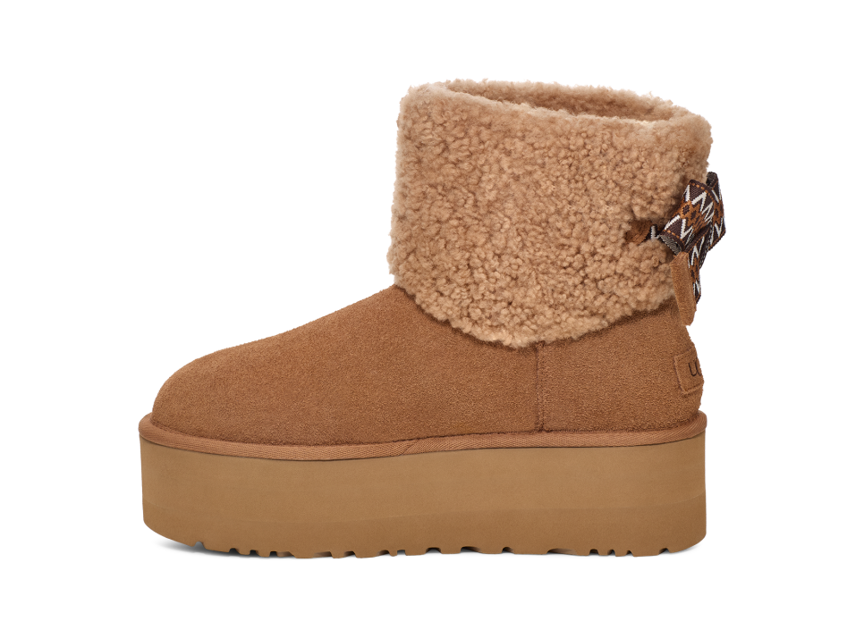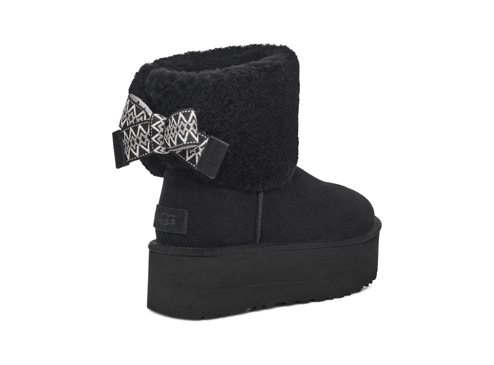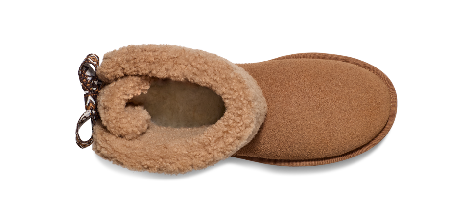 - UGGbraid detailing, Fixed bow, Suede heel counter, Suede vamp, 10mm curly sheepskin shaft